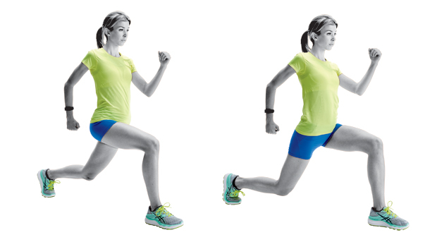 Step forward and lunge down. Then bring your back foot forward and swing it in front, lunging with that leg. Continue lunging forward, alternating legs. Do 3 sets of 15 reps, counting right and left together as 1 rep. See top photo.