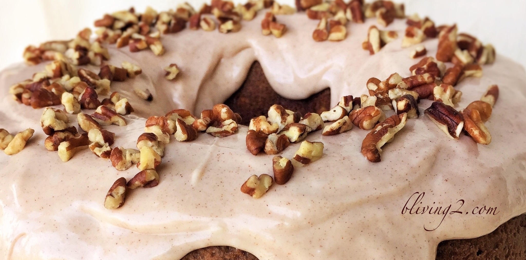 In a large mixing bowl, beat the cream cheese and butter with a mixer on medium speed. Gradually beat in the powdered sugar, cinnamon, followed by the vanilla, mix until smooth. Spread frosting over the cooled cake on a plate. I sometimes like to place a few pecans on top for decoration. Happy Baking!