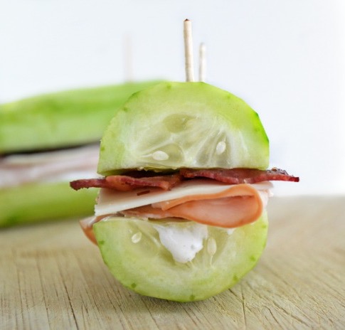 If you are looking for a way to use all those cucumbers from your garden and save calories this is a great recipe. No bread sandwiches, are a great way to eat a light lunch that fills you up without being heavy on your tummy. So you can get back to enjoying all those summer activities. I like to use my grape tomatoes by putting them on the toothpick and sticking through the fresh cucumbers sandwich.