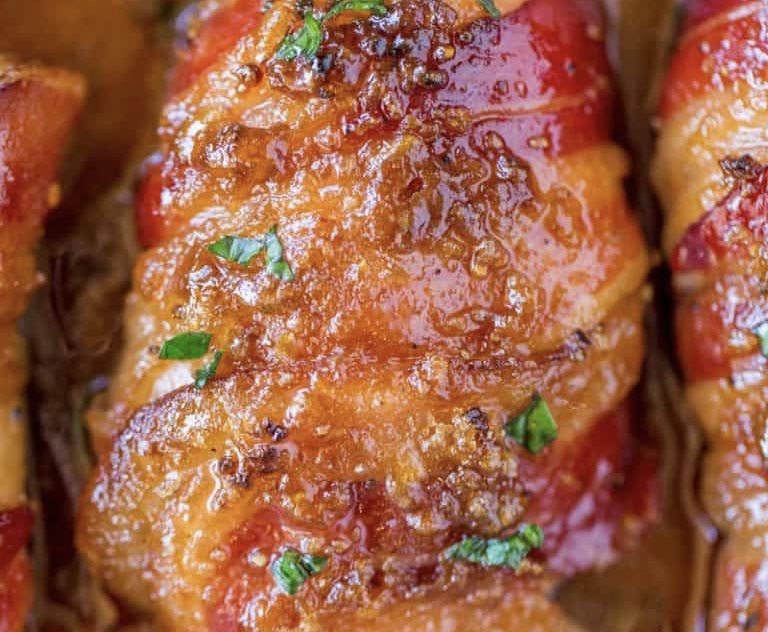 Wrap each piece of chicken with two slices of bacon tuck ends of bacon under chicken.