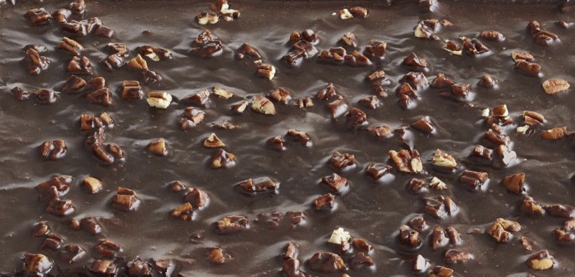 While cake is baking, make the icing. Chop pecans finely. Melt butter in a saucepan. Add cocoa, stir to combine, then turn off heat. Add the milk, vanilla, and powdered sugar. Stir together. Add the pecans, stir together, and pour over warm cake.