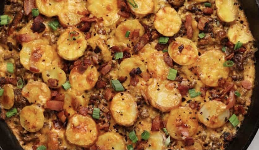 Line half of the sliced potatoes on the bottom of the skillet cover with the ground beef, top with remaining sliced potatoes