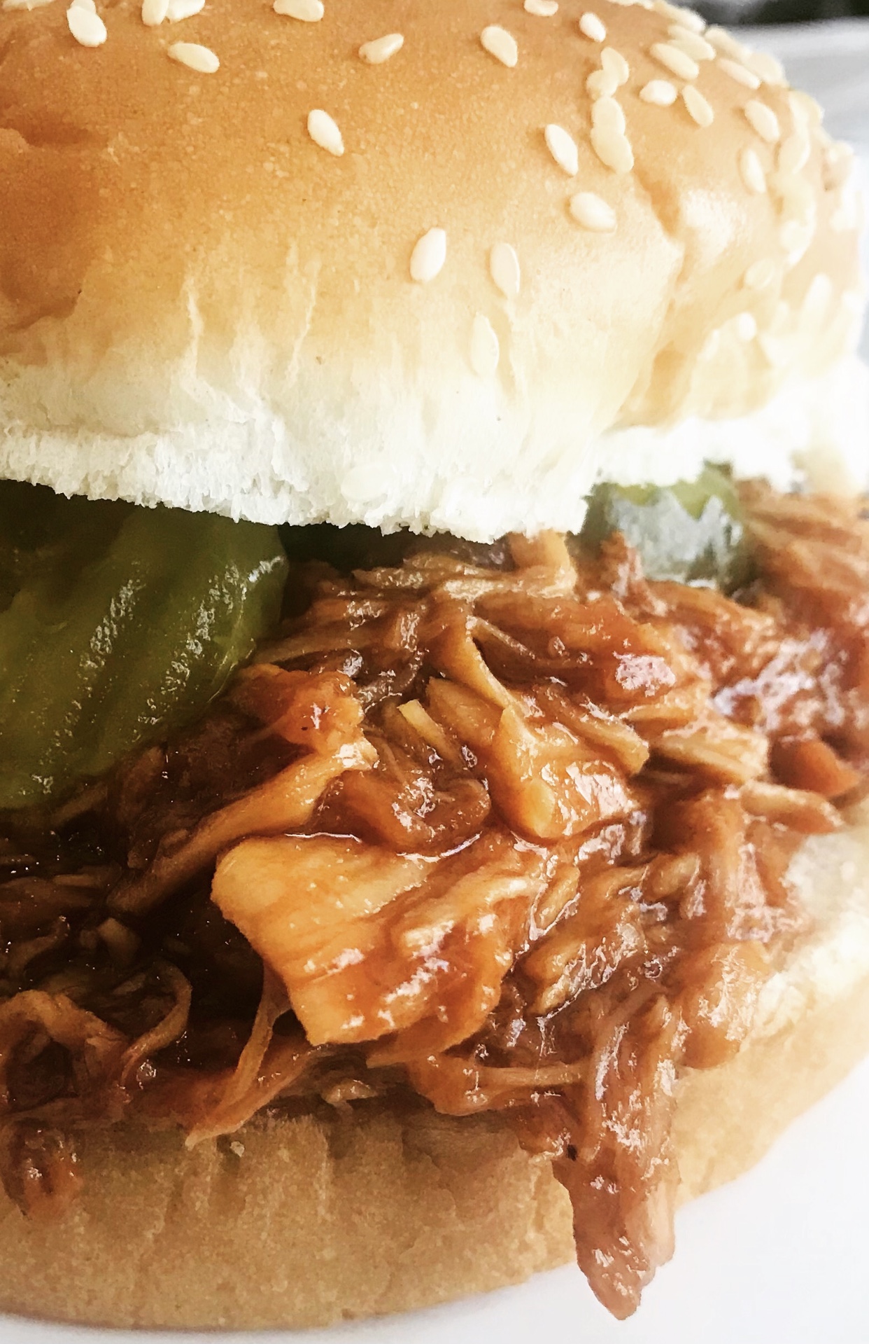 Why Dr. Pepper Chicken BBQ, because my husband and son both love DP! That is their absolute favorite soda, so my son was coming home for the weekend and I wanted something easy to make while we were working on an outdoor project. I had a rotisserie chicken, I had picked up from Costco, and thought, bbq sandwiches would be perfect! So I opened the refrigerator and saw the DP and thought…I’m going to try something new, a new favorite was born! I served this on grilled buns with pickles but I have also put it over baked potatoes.