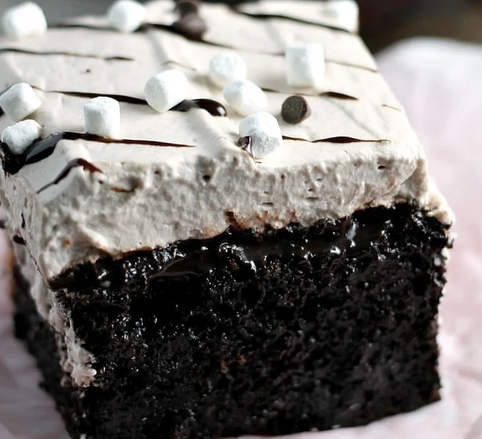 This cake is like a cup of cocoa including marshmallows and whipped cream! I love the dark fudge flavor.
