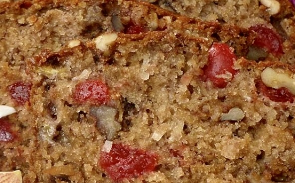 Add the walnuts, eggs, oil, banana, pineapple, vanilla, coconut and cherries, stir until blended.